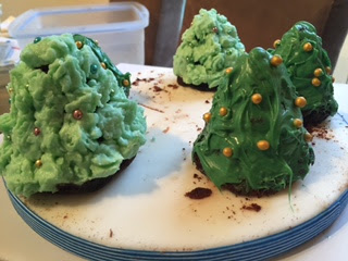 They needed decorating of course and I decided to try two methods, buttercream and candy melts. I mixed some butter and icing sugar to make buttercream, added green food colouring and filled a large piping bag fitted with a star nozzle. I went around each cake from the bottom piping a small blob and pulling the tip away, moving upwards a layer at a time, in the hope that these would resemble the pine needles. I decorated the trees with different coloured dragees (balls) which I thought gave the effect of fairy lights on the tree.