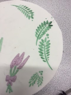 Instead, we continue to work on a covered board, using the same board we'd used in previous weeks as you can see from the picture. I had my own set of stencils though I'd never used them, so chose a leaf pattern and added some green to my royal icing. I used a bit of masking tape to fasten the stencil to the board, as you don't want it to move, and spread the icing over the top. You want to spread the icing as thinly as possible. Carefully remove the stencil and you can see it does look good.